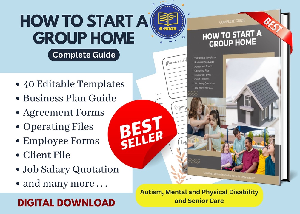A complete guide to start your Group home service business with 30 more fully editable template in Canva and word format as well as fillable PDF forms.