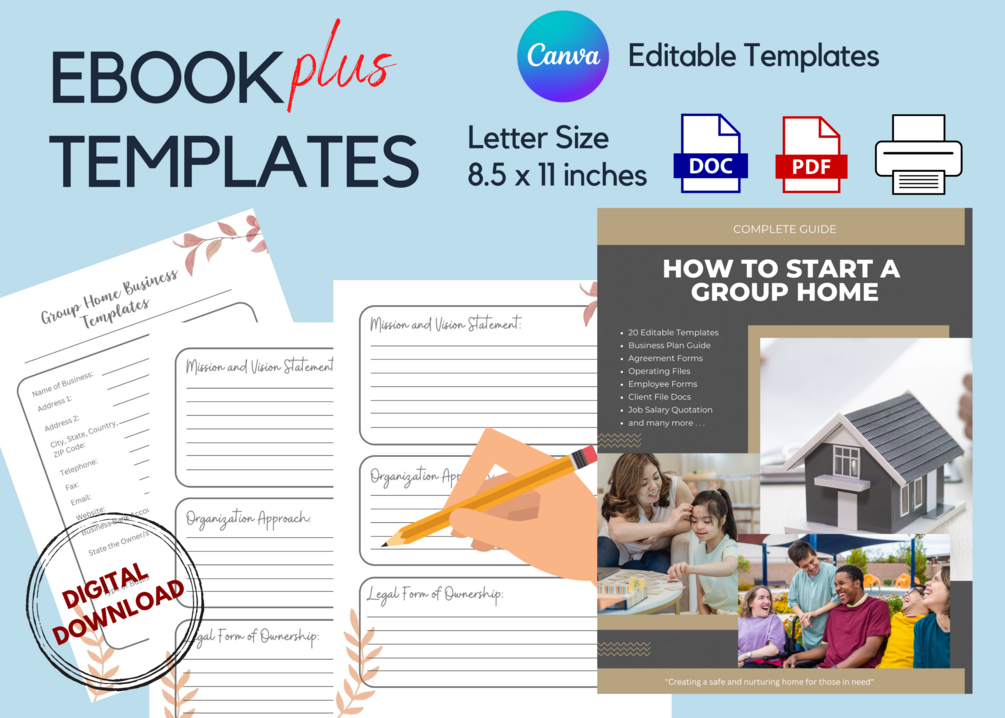 A complete guide to start your Group home service business with 30 more fully editable template in Canva and word format as well as fillable PDF forms.