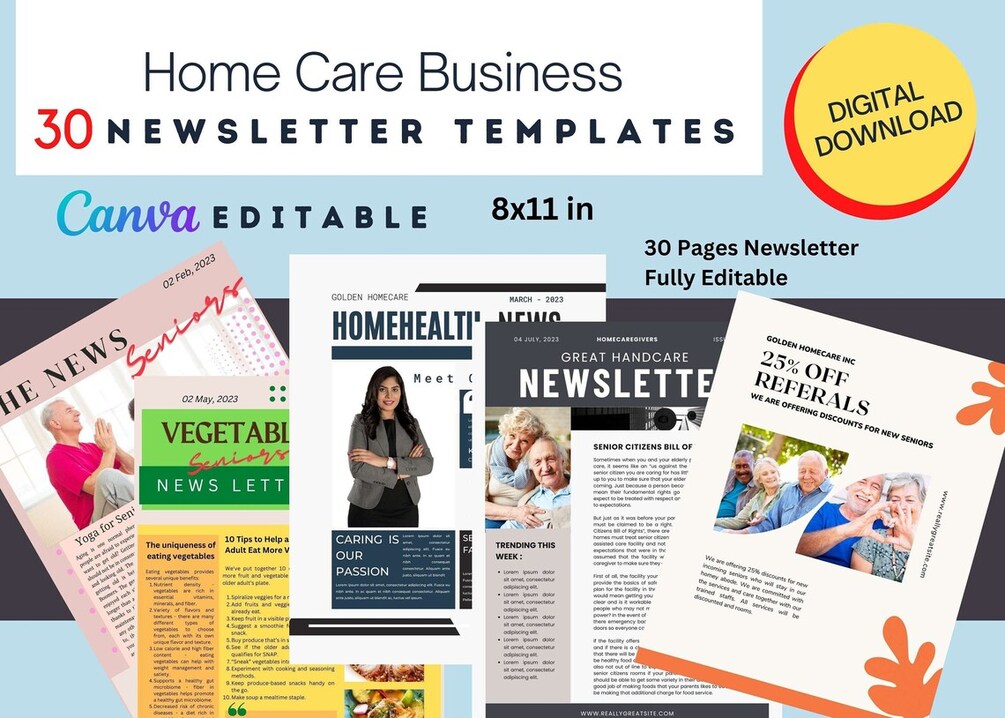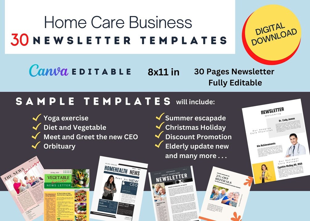 Homecare Business 30 Newsletter Templates, Canva Editable, Home Health Brochure, Flyers and Pamphlet, Nursing Home Newsletter Bundle