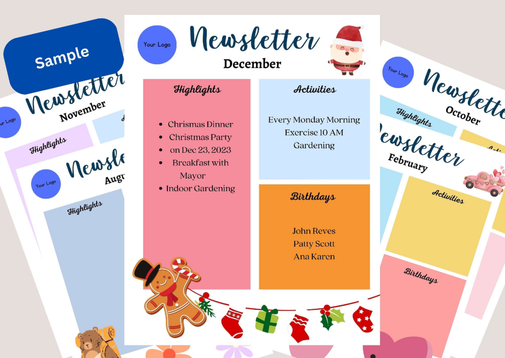 Home care Newsletter Editable Templates, Pastel Monthly Canva Templates Activity Sheets, Customizable, Fillable PDF, Nursing Home Newsletter.